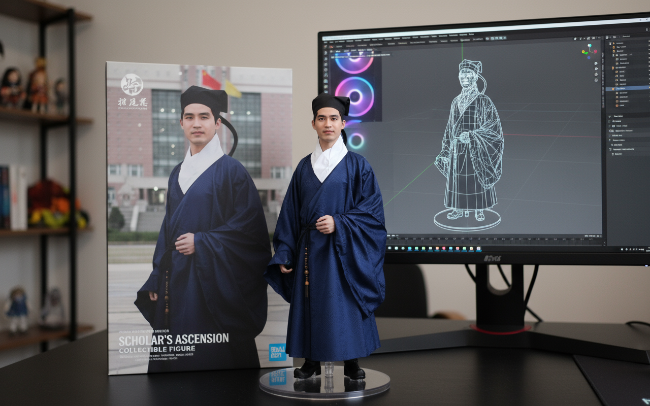 Please turn this photo into a character figure. Behind it, place a box with the character’s image printed on it. Next to it, add a computer with its screen showing the Blender modeling process. In front of the box, add a round plastic base for the figure and have it stand on it. The PVC material of the base should have a crystal-clear, translucent texture, and set the entire scene indoors.