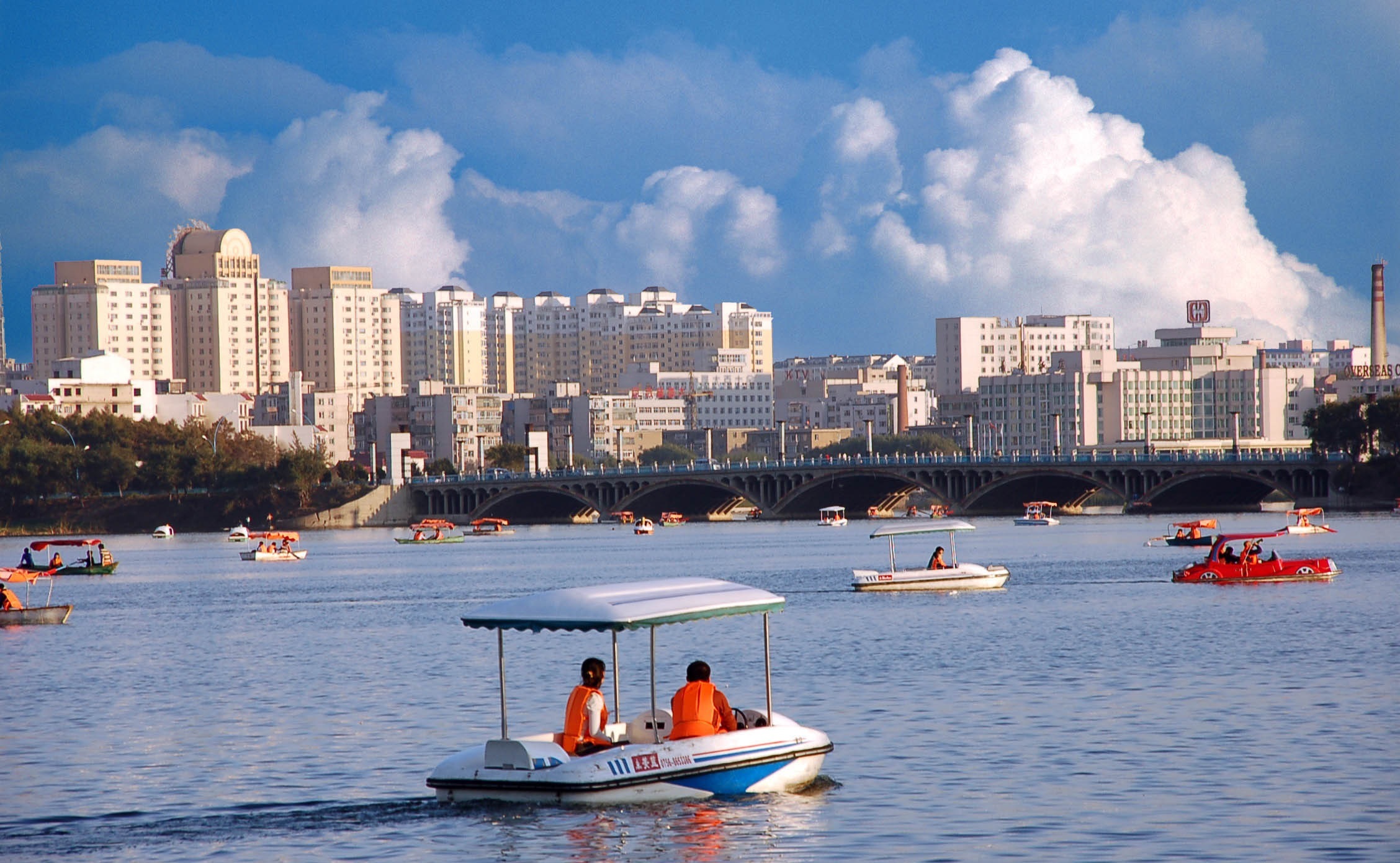 南湖相離東師大不遠不近,是處春波遼闊,煙柳纖柔,與玄武湖的清風微拂倒是極其相類,止是南京現在應該沒有這般涼爽愜意了。湖岸和島上都有市民在散步,湖面上還浮着好些隻腳踏船,這份悠閒讓我豔羨不已。